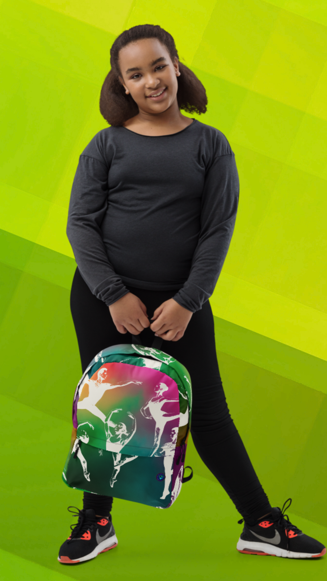 Carry your love for the arts wherever you go! This all-over print backpack brings the elegance of ballet to life with vibrant Technicolor dancers front and center. The sleek black back and straps keep it grounded and versatile while the front stays bold, bright, and on pointe. Whether you're headed to class, rehearsal, or just living that artsy life, this backpack is your perfect standing ovation in motion.